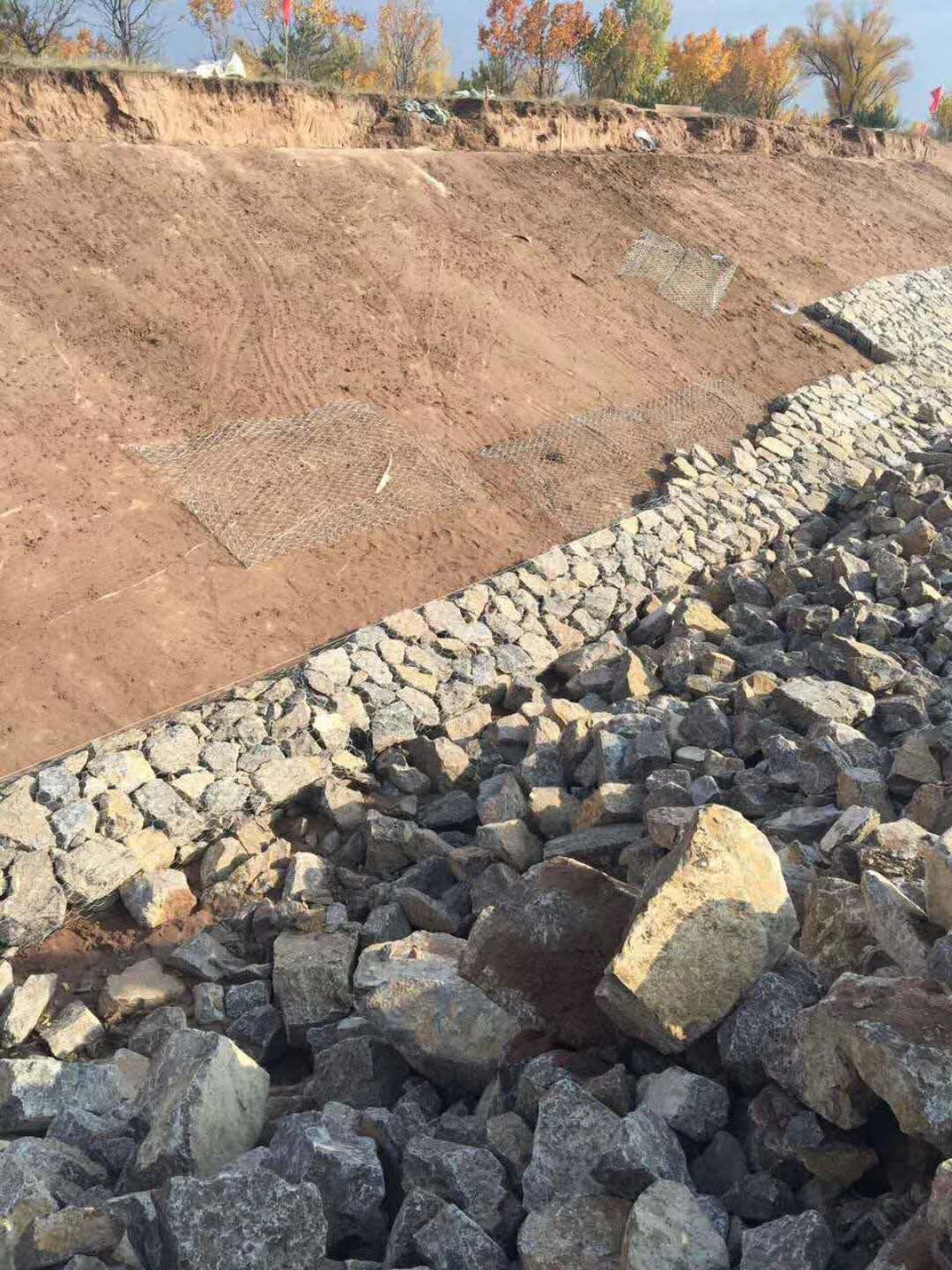 功夫不負(fù)有心人,在隆源公司的積極推動(dòng)下,最終在傅苦六標(biāo)施工段采用新技術(shù)工藝編制的鋼絲石籠順利施工實(shí)施,該項(xiàng)成果轉(zhuǎn)化宣告實(shí)現(xiàn)實(shí)質(zhì)性應(yīng)用。本次傅苦六標(biāo)施工段落共計(jì)385米,石籠用量1545套,總重量33.25噸。編制鋼絲石籠采用定制加工的特種鍍層鋼絲,采用專用設(shè)備編制,網(wǎng)片與邊框張拉固定,每個(gè)網(wǎng)片只有一個(gè)焊點(diǎn),采用定制材料噴涂處理,最大限度的減少了焊接對(duì)鍍層的破壞,提高了鋼絲石籠的整體防腐壽命,編織網(wǎng)片立體感強(qiáng),在現(xiàn)場(chǎng)裝填片石后線性美觀整齊。